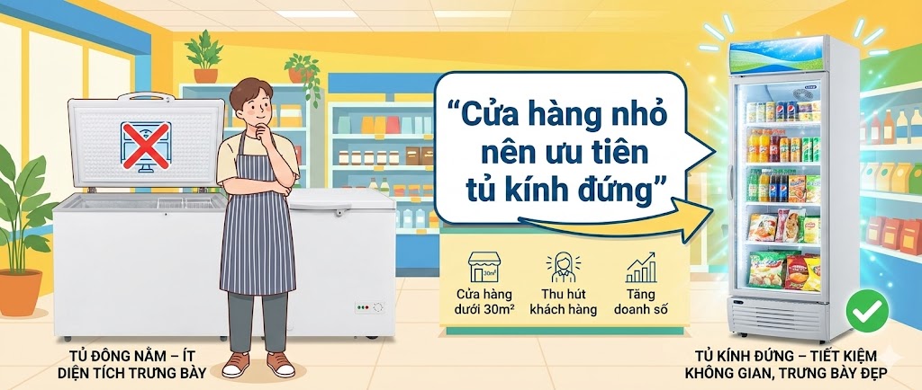 Góc nhìn cho nhà bán lẻ nhỏ: Cửa hàng tạp hóa diện tích dưới 30m² nên ưu tiên tủ kính đứng để tối ưu không gian và tăng hiệu quả trưng bày, mặc dù chi phí đầu tư cao hơn 15-20%.